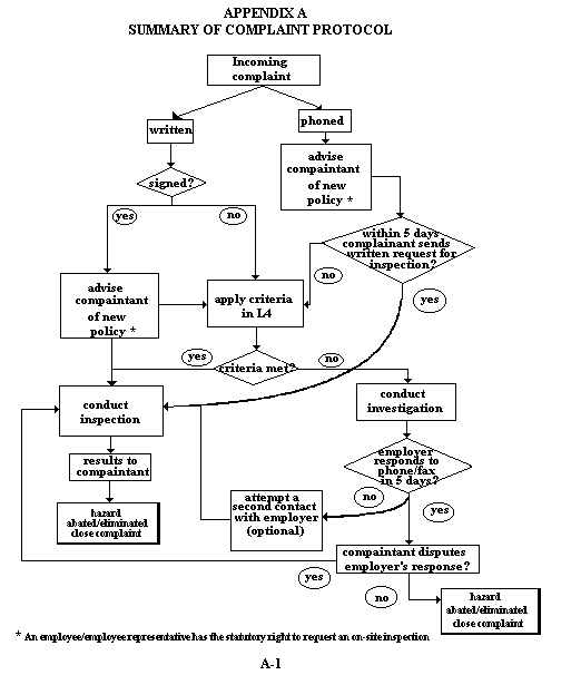 (For Appendix A, Click Here) APPENDIX B OPTIONAL INFORMATION TO BE OBTAINED Obtain information from the caller by asking the following questions, where relevant; For all complaints: What is the hazard? _________________________________________________ How are workers exposed to this hazard? Describe the unsafe or unhealthful conditions; identify the location. ______________________ _____________________________________________________________________ What work is done in the unsafe/unhealthful area? Identify, as well as possible, the type and condition of equipment in use, the materials (i.e. chemicals) being used, the process/operation involved, and the kinds of work being done near the hazardous area. Have there been any recent chemical spills, releases, or accidents? _____________________ _____________________________________________________________________ _____________________________________________________________________ With what frequency are workers doing the task which leads to the exposure? Continuously? Every day? Every week? Rarely? For how long at one time? How long has the condition existed as far as can be determined? Has it been brought to the employer's attention? Have any attempts been made to correct the condition, and if so, who took these actions? What were the results? _____________________________________ _____________________________________________________________________ _____________________________________________________________________ _____________________________________________________________________ How many shifts are there? What time do they start? On which shift does the hazardous condition exist? _________________________________ _____________________________________________________________________ What personal protective equipment (i.e., hearing protection or respirators) is required by the company relevant to the alleged exposure? Is it used by employees? Include all PPE and describe it as specifically as possible. Include the manufacturer's name and any identifying numbers. ________________________________________________ _____________________________________________________________________ How many people work in the establishment? How many are exposed to the hazardous conditions? How near do they get to the hazard? _____________________________________________________________________ _____________________________________________________________________ Is there an employee representative (union) in the establishment? Include the name, address, and telephone number of the union and/or the employee representative(s). _________________________________________ _____________________________________________________________________ For health hazards: Has the employer administered any tests to determine employee exposure levels to the hazardous conditions or substance? Describe these tests. What were the results? Can the employees get the results (as required by the standards)? __________________________________________________ _____________________________________________________________________ What engineering controls are in place in the area(s) in which the exposed employees work? For instance, are there any fans or acoustical insulation in the area which may reduce exposure to the hazard? _____________________________________________________________________ _____________________________________________________________________ What administrative or work practice controls has the employer put into effect? _____________________________________________________________ Do any employees have any symptoms which may have been caused by exposure to hazardous substances? Have any employees ever been treated by a physician for work-related disease or condition? What was it? _____________________________________________________________________ _____________________________________________________________________ Have there been any "near-miss" accidents? __________________________ _____________________________________________________________________ Are respirators worn to protect against health hazards, and if so, what kinds? What exposures are they protecting against? _____________________________________________________________________ If the complaint is related to noise, what, if any, hearing protection is provided to and worn by the employees? ___________________________ _____________________________________________________________________ For safety hazards: Under what adverse or hazardous conditions are employees required to work? This should include conditions contributing to stress and "other" probability factors. ________________________________________________ _____________________________________________________________________ Have any employees been injured as a result of this hazardous condition? Have there been any "near miss" incidents?___________________________ _____________________________________________________________________ APPENDIX C SAMPLE LETTERS Re: Complaint No. Dear : On the Occupational Safety and Health Administration (OSHA) received notice of safety and health hazards at your worksite. We notified you, by telephone, of these alleged hazards on ______. The specific nature of the alleged hazards is as follows: We have not determined whether the hazards, as alleged, exist at your workplace; and we do not intend to conduct an inspection at this time. However, since allegations of violations have been made, we request that you immediately investigate the alleged conditions and make any necessary corrections or modifications. Please advise me in writing, no later that of the results of your investigation. You must provide supporting documentation of your findings, including any applicable measurements or monitoring results, and photographs which you believe would be helpful, as well as a description of any corrective action you have taken or are in the process of taking. This letter is not a citation or a notification of pr