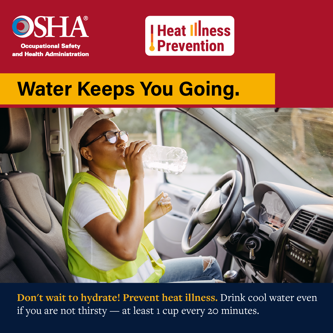 - Hydrate before, during and after work. Drink 1 cup of cool water every 20 minutes even if you aren’t thirsty. For longer jobs, drinks with electrolytes are best. Avoid energy drinks and alcohol.